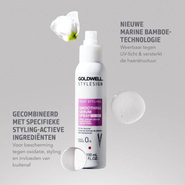 Goldwell StyleSign Smoothing Serum Spray is volledig vegan en maakt gebruik van de kracht van ecologische Marine Bamboo en zorgvuldig geselecteerde actieve stylingingrediënten die specifiek op dit product zijn afgestemd. Met tot 85% minder haarbreuk door hittestyling, biedt dit serum spray een onmisbare bescherming voor elk haartype, ongeacht de textuur.