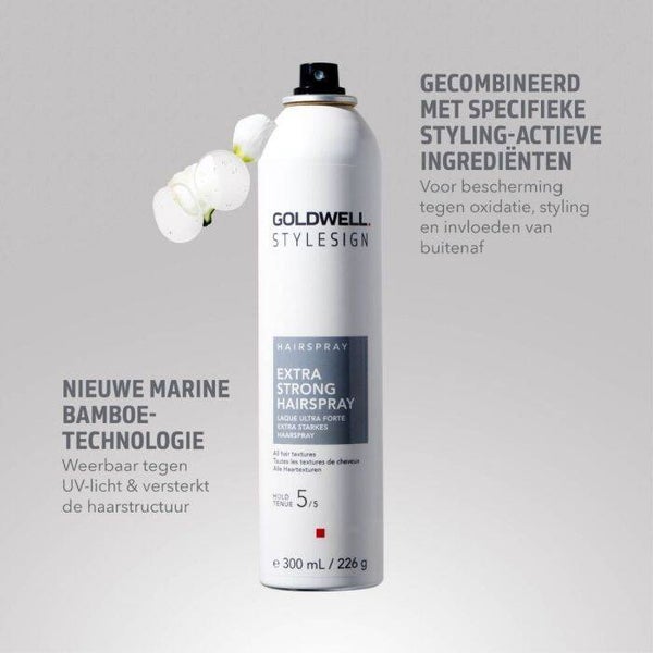 Goldwell StyleSign Extra Strong Hairspray is ontworpen voor iedereen die behoefte heeft aan een sterke haarspray met een goede houdbaarheid. Deze haarspray biedt tot wel 72 uur lang effectieve bescherming tegen vochtigheid en pluis. Dankzij de formule, getest in omstandigheden tot windkracht 6, blijft je haar ook bij stevige wind goed in model.