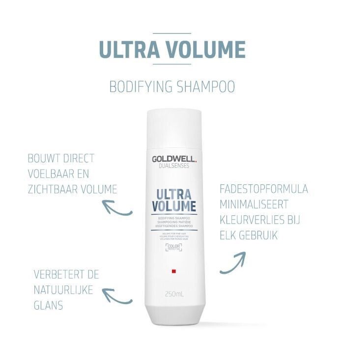 Goldwell Dualsenses Ultra Volume Bodifying Shampoo biedt een krachtige boost voor fijn en slap haar. Deze shampoo, zo mild als puur water, zorgt ervoor dat het haar direct voelbaar en zichtbaar meer volume krijgt. Dankzij de unieke FadeStopFormula wordt kleurverlies geminimaliseerd bij elk gebruik, waardoor het haar langer stralend en levendig blijft.
